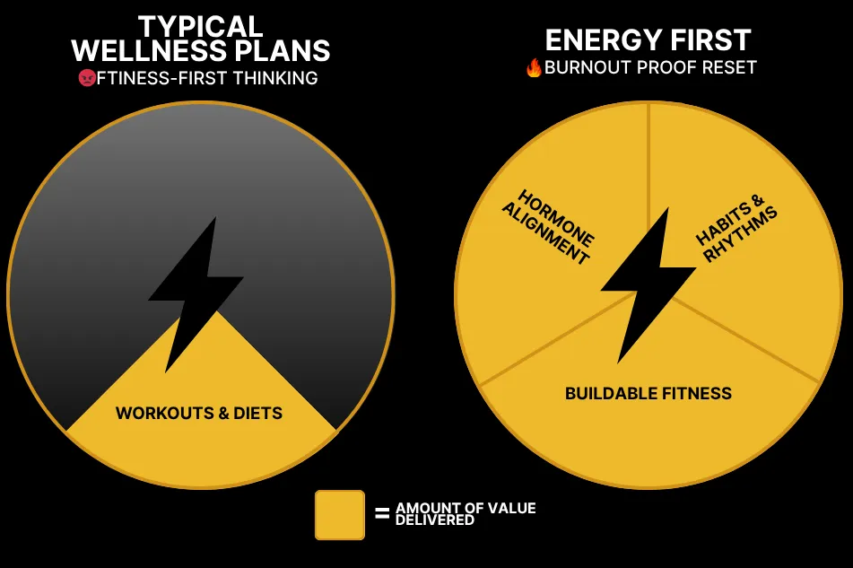 It helps you align your hormones, daily rhythms, and habits — so you can reclaim your energy before touching another workout, supplement, or diet plan.
